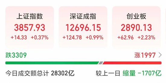 今日,沪指午后横盘震荡,创业板指维持强势。截至收盘,上证指数涨0.37%,深证成指涨0.99%,创业板指涨2.23%。市场成交额超2.83万亿元,连续第6个交易日突破2.5万亿元。