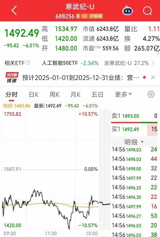 宁德时代今日盘中最高涨超14%,股价重回300元上方,截至收盘涨10.37%,报306.18元/股;工业富联尾盘涨停,总市值为1.07万亿元,成交额超173亿元;寒武纪回调,收盘跌6.01%,报1492.49元/股,仍高于贵州茅台收盘价1480元/股。