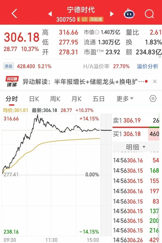 今日,锂电产业链表现强势,宁德时代盘中最高涨超14%,股价重回300元上方,截至收盘涨10.37%,报306.18元/股,成交额超234亿元。